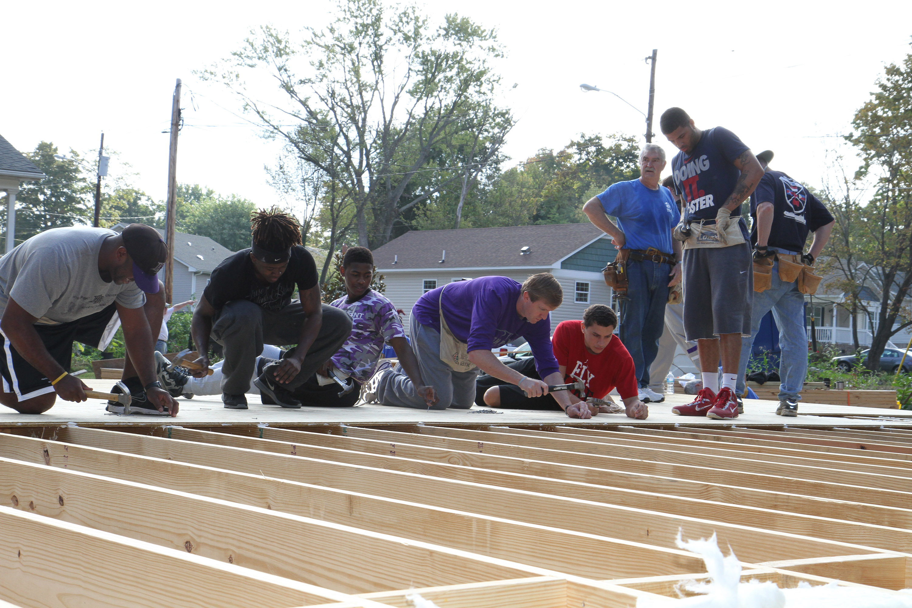 The men’s basketball team is one of several HPU teams volunteering for Habitat for Humanity this fall. Around campus, members of High Point’s faculty are volunteering on Thursday. There’s a campus chapter of Habitat for Humanity and many fraternities, sororities and other organizations also volunteer.