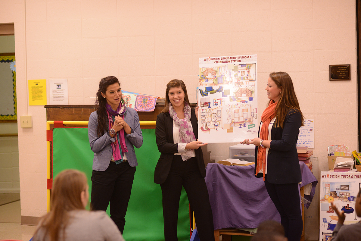 Groups of students in the service learning Contract Design class were challenged with creating an inviting, functional and fun space for the after-school program that helps students with their reading and writing skills. The team of Ashely Tizard, Caroline Goree and Catherine Ruvolo won the competition with their “The Write Way” design. It focuses on cultivating the children’s innate intelligence, celebrating their talents and boosting their self-esteem by dividing the center into three separate spaces, the group activity room, the celebration station and the tutor room.