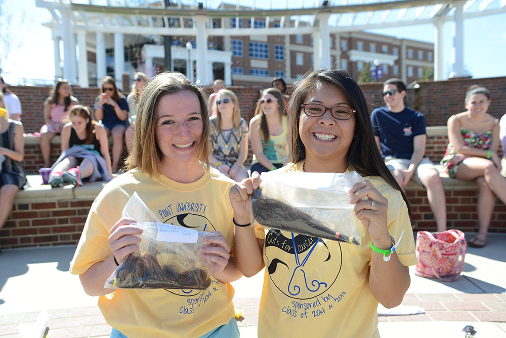 HIGH POINT, N.C., April 9, 2014 – A group of High Point University students recently gathered at the campus amphitheater to cut off their locks for the annual “Cuts for Cancer” event on April 5. The program, now in its fourth year, allowed participants, or “angels,” to each donate at least eight inches of hair that will be made into wigs for cancer patients who otherwise can’t afford them.