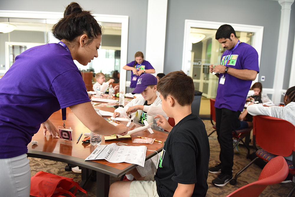 Above: Ashwaq Althubity, a graduate student in HPU’s Stout School of Education (right), leads (from left to right) Adam Koonce, Riley Lemons and Sean Edwards, rising fifth-graders at the North Carolina Leadership Academy, through a rocket building activity.