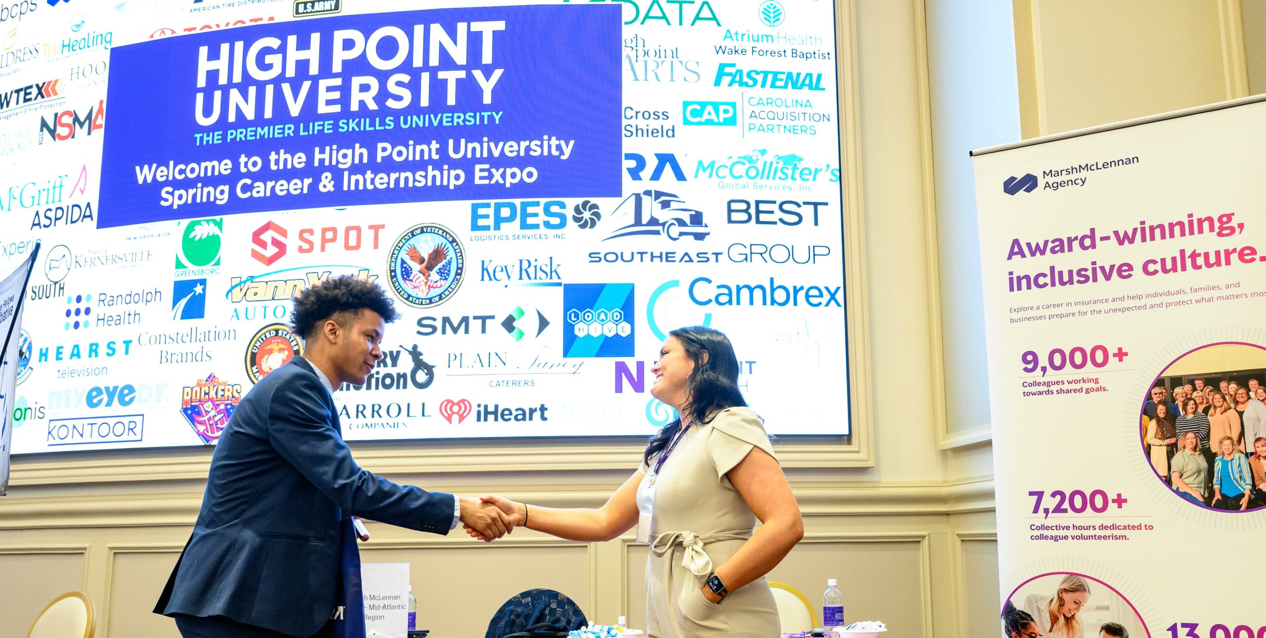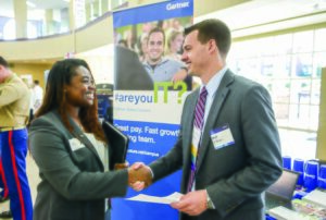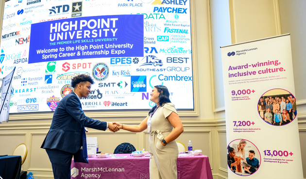 With a firm handshake, HPU students have the opportunity to connect with global representatives as they network their way through the Nido and Mariana Qubein Arena and Conference center for HPU’s annual Career and Internship Expo. Hosted by the Office of Career and Professional Development, employers visit campus to meet with students and participate in presentations.