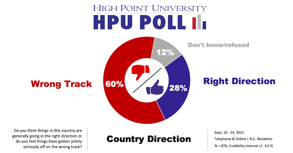 More than half (60%) of North Carolinians said the country is off on the wrong track. Approximately one-third (28%) of those same residents said the country is headed in the right direction.