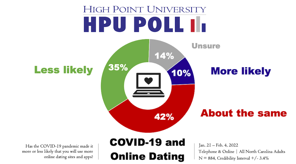 HIGH POINT, N.C., Feb. 11, 2022 –The latest High Point University Poll asked North Carolina adults about their use of online dating sites or apps, given that Valentine’s Day is just around the corner. Of those surveyed, two-thirds (66%) said that they have not used an online dating site or app, and 33% indicated that they have used an online dating site or app.