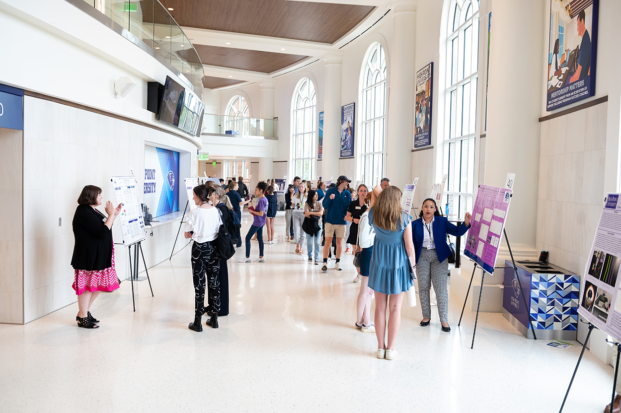 Students lined HPU’s Qubein Arena concourse with poster presentations that showcase the months of research and work they’ve compiled. They researched a multitude of topics, including biology, chemistry, exercise science, art and design, mathematical sciences, pharmacy, popular culture and media production, psychology, strategic communication and game design.