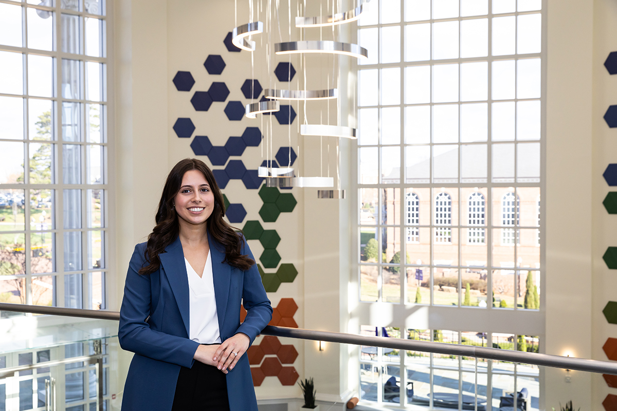 HPU senior Grace Todd, a biochemistry major from Johnstown, Ohio, was accepted to six medical schools and plans to attend Ohio University’s Heritage College of Medicine after graduation. She is pictured in the Wanek School of Natural Sciences, where orange, green and blue colors climbing the lobby’s walls represent the earth’s core, surface and atmosphere.