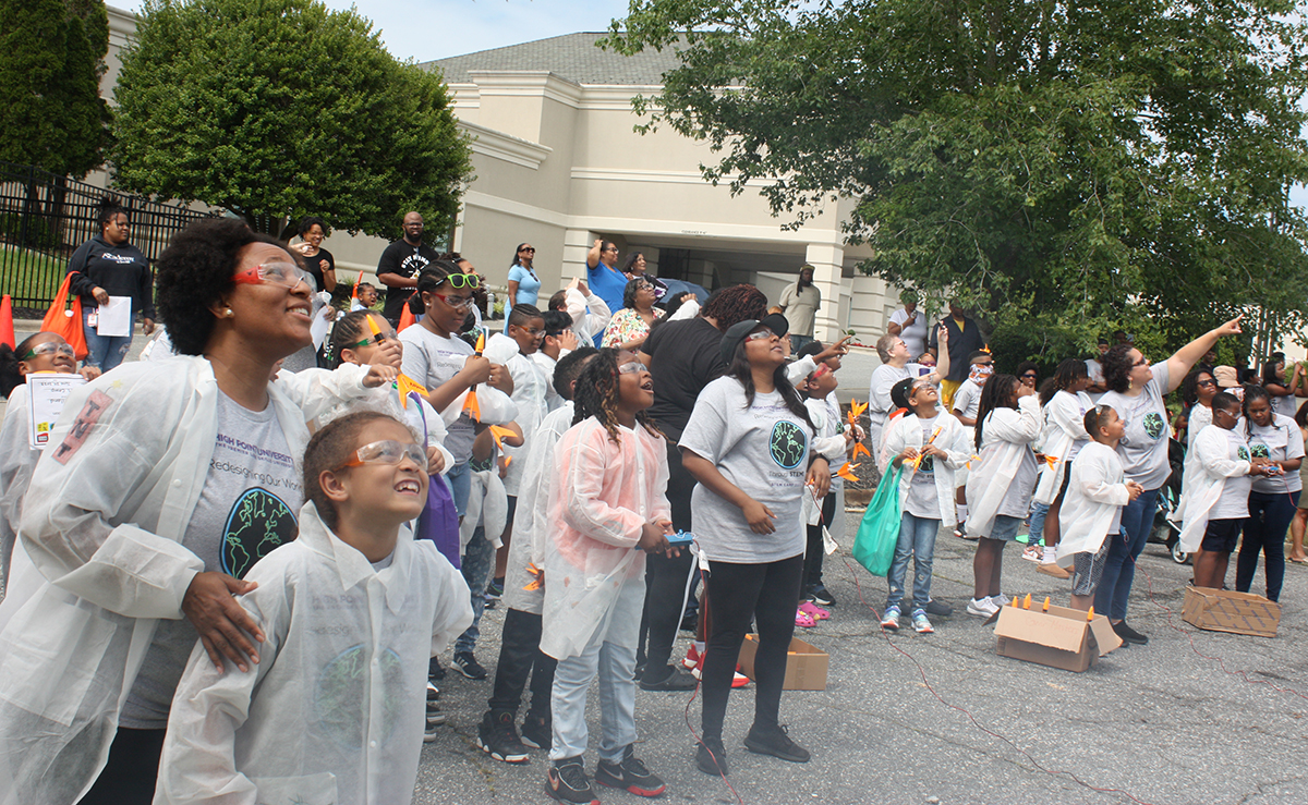 Local children learned about science, technology, engineering and math as High Point University’s Stout School of Education hosted its 10th annual STEM Camp and provided a full week of fun science, technology, engineering and math activities. Pictured at left is Tiffany Taylor, an HPU student and teacher in the PREPARE program, reacting along with students and other teachers as rockets launched Saturday morning outside The Point – College Prep and Leadership Academy.