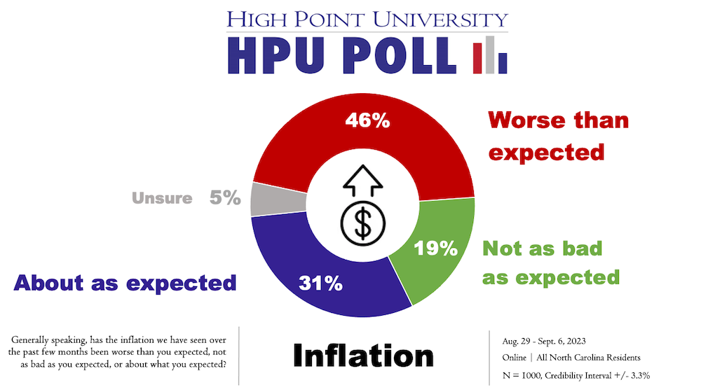 Inflation is still very much on the minds of North Carolinians interviewed for the newest HPU Poll. Almost half (46%) of North Carolina residents say the inflation over the past few months had been worse than they expected.