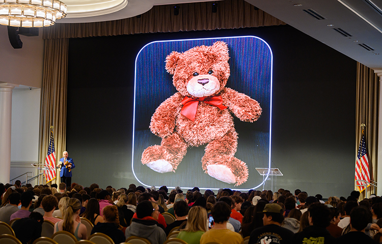 HIGH POINT, N.C., Nov. 17, 2023 – High Point University President Nido Qubein shared a meaningful lesson on gratitude on Nov. 16. During his First-Year Seminar on Life Skills for freshmen, he gave each of them a teddy bear and challenged them to give it to someone who has helped them.