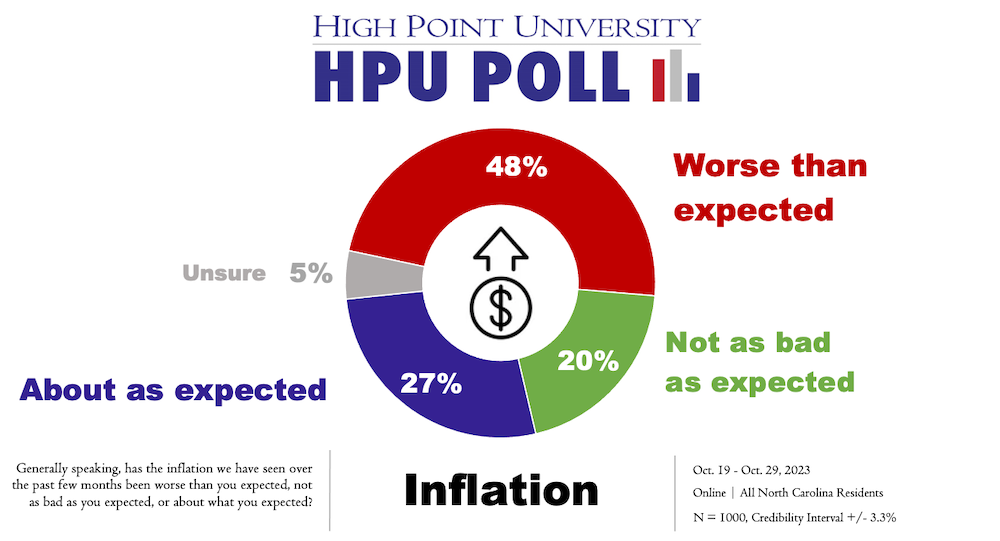 HIGH POINT, N.C., Nov. 7, 2023 – Inflation is still very much on the minds of North Carolinians interviewed for the newest HPU Poll. More than half (54%) of North Carolina residents responding to the survey say inflation concerns have affected a lot of their spending decisions this year. About one-third (31%) say inflation concerns have affected some of their spending decisions, and only 12% say inflation concerns haven’t affected them much at all.