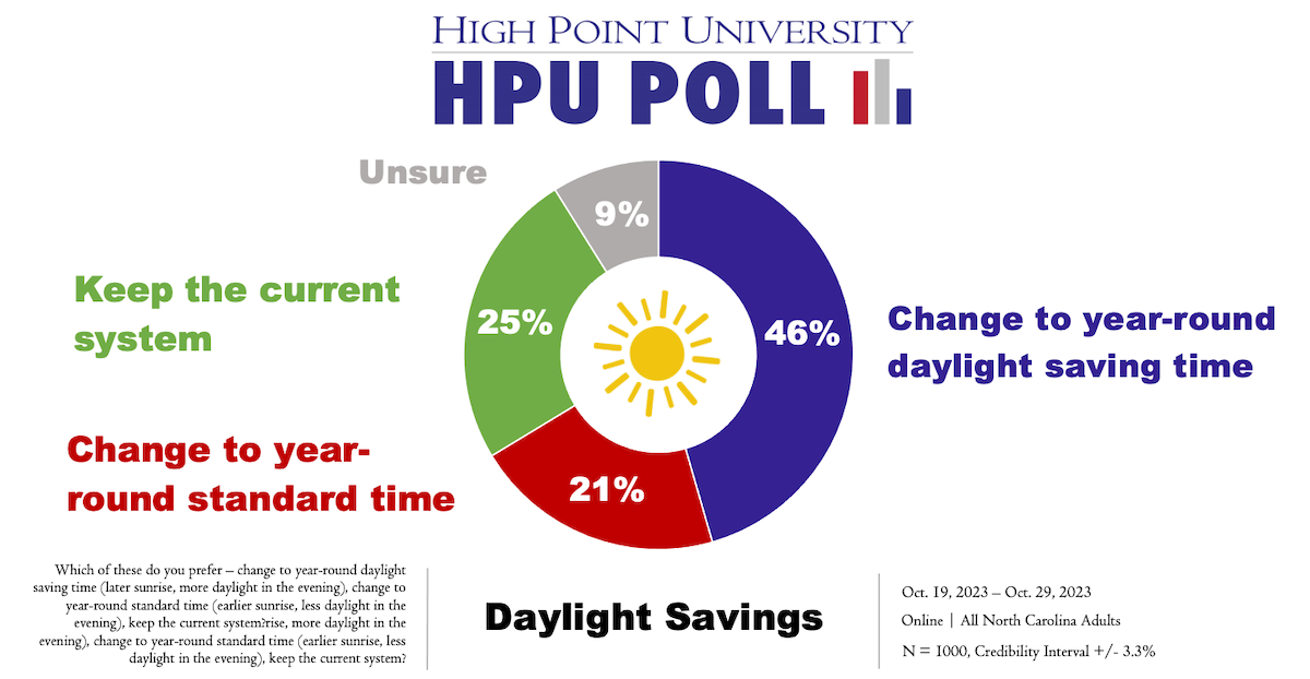 HIGH POINT, N.C., Nov. 1, 2023 – The latest High Point University Poll finds that nearly a majority of poll respondents (46%) prefer changing to year-round daylight saving time. That would mean a later sunrise and more daylight in the evening. This is a similar finding to a March 2023 poll when we set clocks ahead.