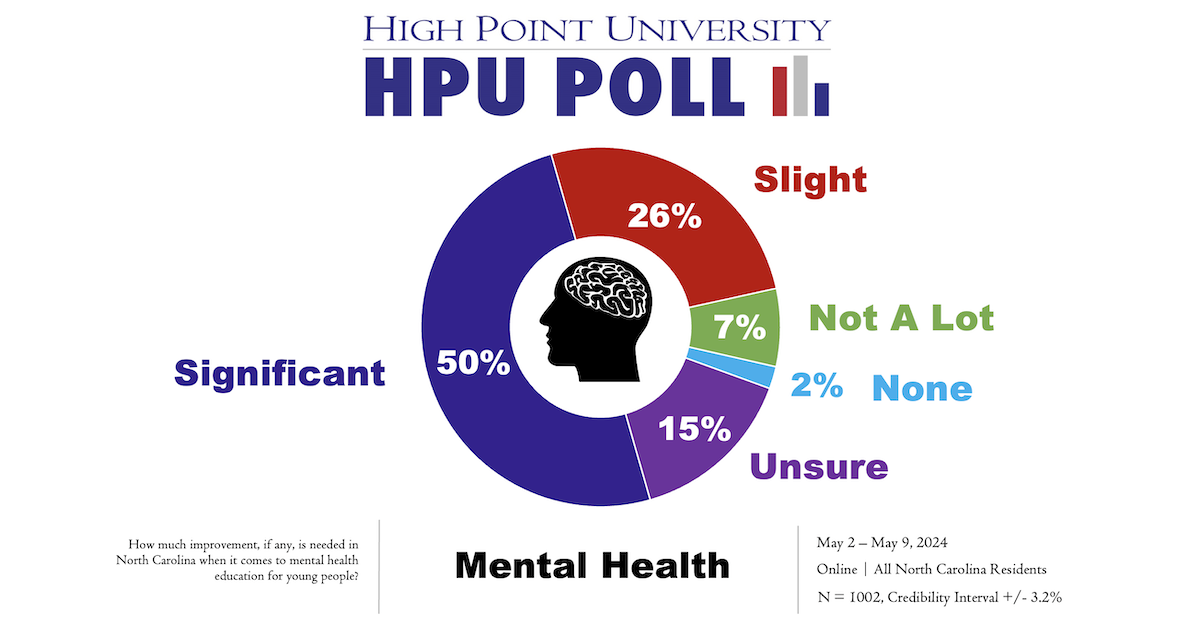 HIGH POINT, N.C., May 31, 2024 – A new High Point University Poll, conducted in honor of Mental Health Awareness Month in May, finds that majorities of North Carolina residents (50%) said significant improvement is needed in North Carolina when it comes to mental health education for young people. Another one-quarter said slight improvement is needed (26%), and less than 10% said not a lot of improvement is needed (7%) or there is no need for improvement (2%) when it comes to mental health education for young people.