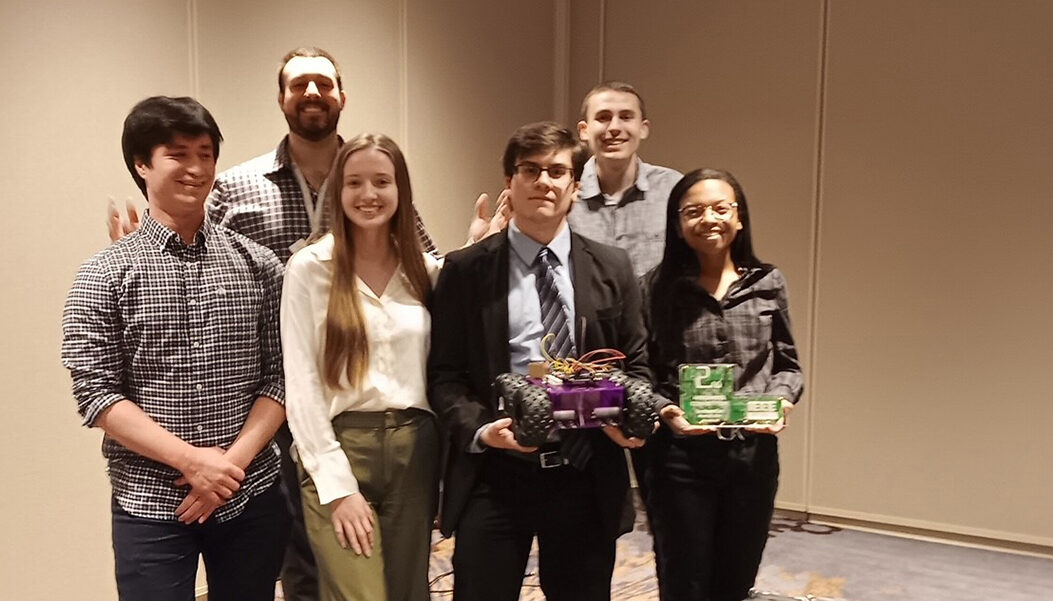 HPU’s Robotics Club recently won second place for its robot at the 2024 Institute of Electrical and Electronics Engineers (IEEE) SoutheastCon’s student hardware competition in Atlanta, Georgia. Pictured from left are club members Alan Gutschmit, Jordan Destafino, Natalie Roberts, Eric Brockmann, Levi Wenger and Morgan Abrams.