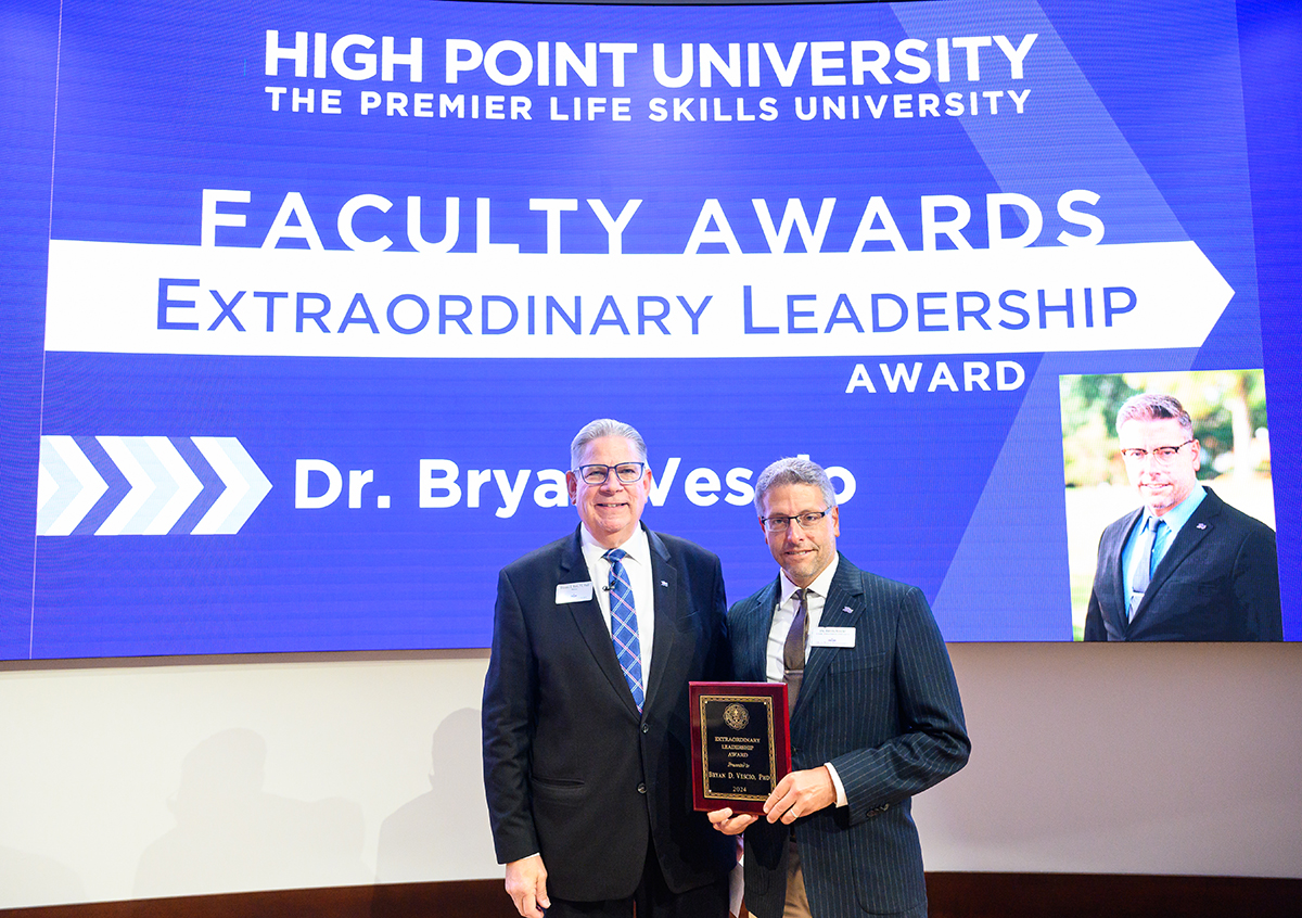 Dr. Daniel Erb, High Point University’s provost, presented the Extraordinary Leadership Award to Dr. Bryan Vescio, professor and chair of the Department of English.