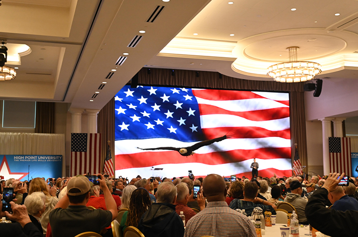 More than 2,000 people attended High Point University’s 13th Annual Veterans Day Celebration at the Nido and Mariana Qubein Arena and Conference Center on Nov. 10, 2023. The program included Clark, a bald eagle that soared above the audience as the HPU Chamber Singers sang “America the Beautiful.”