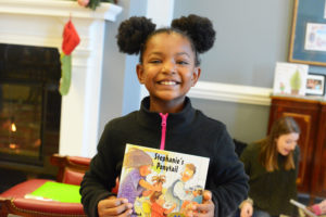 She carried it over to her Book Buddy, HPU junior Brianna Beard, and tore away at the wrapping paper to reveal her favorite book, “Stephanie’s Ponytail,” by Robert Munsch.