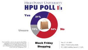 HIGH POINT, N.C., Nov. 24, 2020 – A recent High Point University Poll found 31% of North Carolinians plan to shop on the Friday after Thanksgiving, known as Black Friday. Just over half (54%) polled say they will not shop on Black Friday this year, while 15% are unsure.