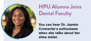 Cromartie earned a Bachelor of Science in biology from HPU in 2013. She went on to earn a Master of Arts in intercultural services in health care from Wake Forest University, and she earned both her Doctor of Dental Medicine and Advanced Education in General Dentistry Certificate with distinction from East Carolina University.
